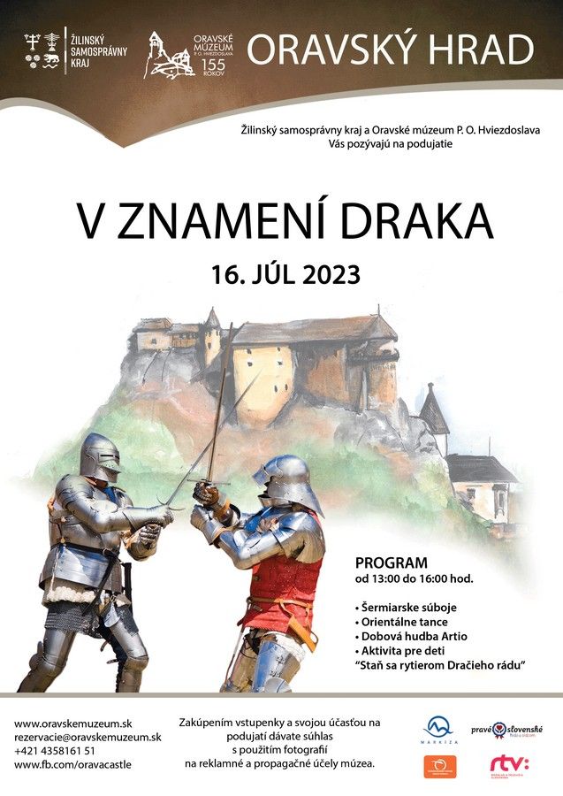 Tretí prázdninový víkend na Oravskom hrade bude patriť rytierom. Hostiteľom bude samotný ctihodný rytier Ctibor zo Ctiboríc, ktorý bol platným členom známeho Dračieho rádu a je úzko spojený s históriou Oravského hradu. Okrem pútavého programu na nádvorí, v ktorom sa predstavia chrabrí rytieri, šikovní hudobníci i tanečníčky, sa môžete tešiť aj na obľúbené aktivity pre deti s názvom „Staň sa rytierom Dračieho rádu“. Ak sa záujemcom o titul podarí úspešne zložiť štyri skúšky, budú pasovaní za rytierov a získajú aj odznak rádu Draka.