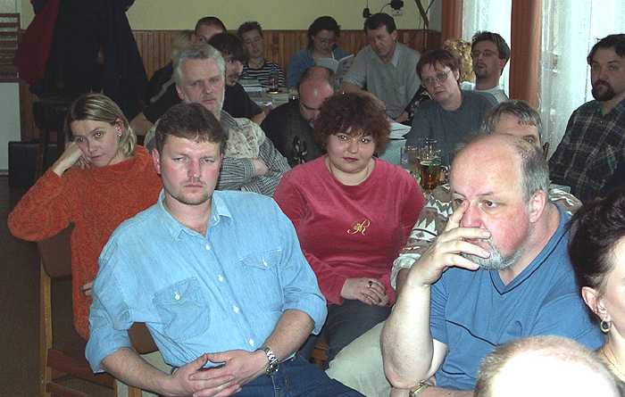 Teraz sme tam dorazili pomerne neskoro, až o jedenástej a prišli sme o informácie o Eurocone (Vašek určite všetkych ohuroval, že čo všetko bude), prezentáciu klubov a akcií v roku 2002 a o správu o činnosti Rady ČSSFF. Dorazili sme však presne na hlasovanie o udelení cien ČSSFF Mlok a Ludvík za rok 2001, ktoré sa budú slávnostne predávať na tohtoročnom Eurocone-Parcone. Pre neznalých veci cena Mlok sa udeľuje za zásluhy, za dlhoročnú prácu pre SF a cena Ludvík sa udeľuje za konkrétny významný počin v uplynulom období. Na Mloka boli nominovaní: Jiřina Vorlová (za Hexaeder a inú prácu pre SF), Ondrej Herec (za propagáciu SF,Cenu Gustáva Reusa), František Novotný (vzdelávanie fanov na conoch) a Pepa Vašát (za danie dokopy administratívnych záležitostí Fandomu). Víťazom s 29 hlasmi z 39 hlasujúcich klubov sa stal Pepa Vašát. Na cenu Ludvík boli nominovaní Jiřina Vorlová (za obetavú prácu bez nároku na odmenu), Istrocon (za vysoko kvalitný con), Kočovní divadelná společnost P.Klíčnika (za divadlo Stráže,Stráže na Parcone), Marwin (za webove stránky Fandomu). Nakoniec to dostane Kočovní divadlo, ktoré vyhralo o 4 hlasy pred Istroconom.