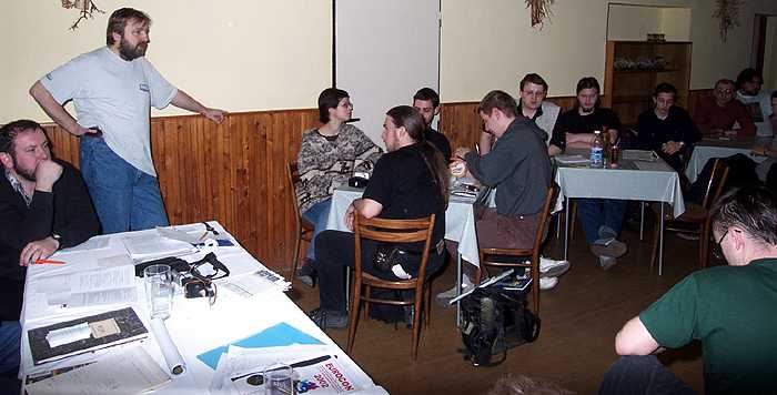 Ahojte. Možno viacerí netušia, že Fandom má aj svoje porady. Jarná porada Česko-Slovenského SF Fandomu (ČSSFF), teda pre zástupcov SF klubov z oboch republík, sa konala teraz v sobotu 13.4.2002 už tradične v Březovej nad Svitavou v penzióne Pohoda. Porada je síce len jeden deň, ale chodievame tam na tri dni, lebo je tam fajn partia a skutočná pohoda, teda až na poradu, kedy sa pekne hádame. Personál je fajn, obsluhujú nás až do rána, strava perfektná, čapuje sa budvar desiatka a výborné moravské vína. Tentoraz som cestoval cez Bratislavu, kde som pribral na cestu do brloháckeho auta ako šoférov Heňu a Mira, a ako užitočnú záťaž Včielku Dášu :-)