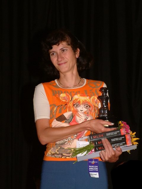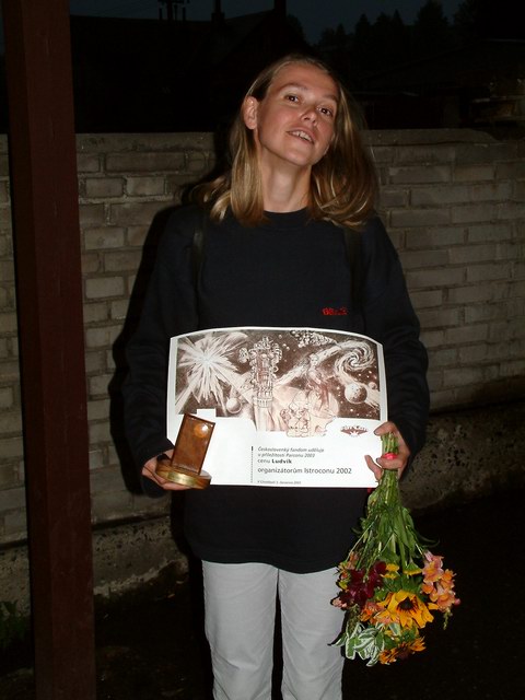 Henka Galgóciová pri preberaní ceny Ludvík, ktorú získali organizátori Istroconu 2002. Cena Karla Čapka za rok 2002 – kategórie román, krátka poviedka a Skrblíkov Mlok za zásluhy. Fantasy show a pasovanie rytierov fantasy – víťazov v súťaži O nejlepší fantasy. Cena Karla Čapka v kategórii dlhá poviedka a absolútne víťazstvo pre Sašu Pavelkovú.