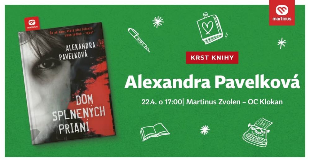 V stredu 22. apríla 2026 o 17:00 hod. bude v priestoroch kníhkupectva Martinus v OC Klokan vo Zvolene krst knihy Dom splnených prianí od Alexandry Pavelkovej spojený s besedou a autogramiádou. Všetci fanúšikovia fantastiky a obzvlásť temnej urban fantasy sú srdečne vítaní. Krstnou mamou bude známa karikaturistka a aktivistka Rosie Naive Art a krstiť sa bude materiálom k Domu najpríhodnejším – rumom. Stavebným.