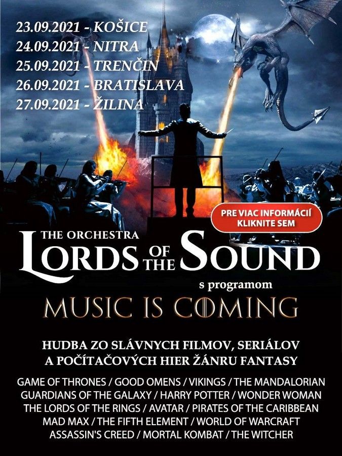 Vystúpenie orchestra LORDS OF THE SOUND nie je len obyčajný koncert, je to naozajstná šou! „Music is coming“ je nepredstaviteľným spojením živého zvuku orchestra, zboru a skutočnej mágie, ktorou sú naplnené vaše obľúbené filmy, seriály a počítačové hry.